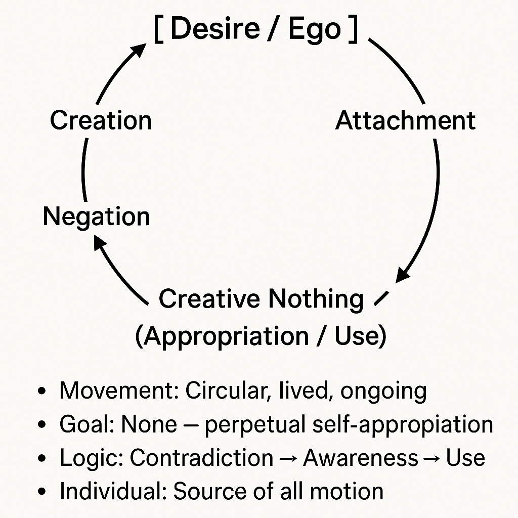 This uniqueness (Einzigkeit) is not an essence or a trait; it is the non-conceptual core of being. Meaning: the creative nothing from which all ideas, identities, and meanings emerge. The ego, for Stirner, is not a thing but a movement. It is the lived rhythm of consciousness producing and consuming its own contents.