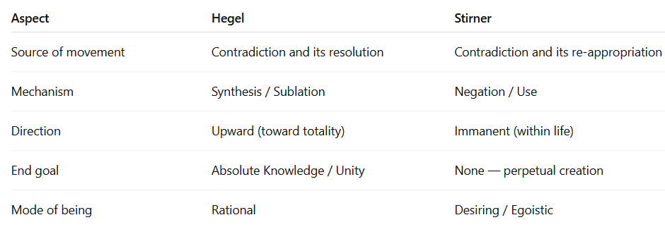 To speak of Stirner as “against synthesis” is not to say he rejects movement itself. What I am trying to say is that the ego, for Stirner, is not static; it is in constant flux, it is constantly creating and dissolving the forms of its own world. The difference between him and Hegel is not about whether there is a dialectic, but about how it moves and what it serves.